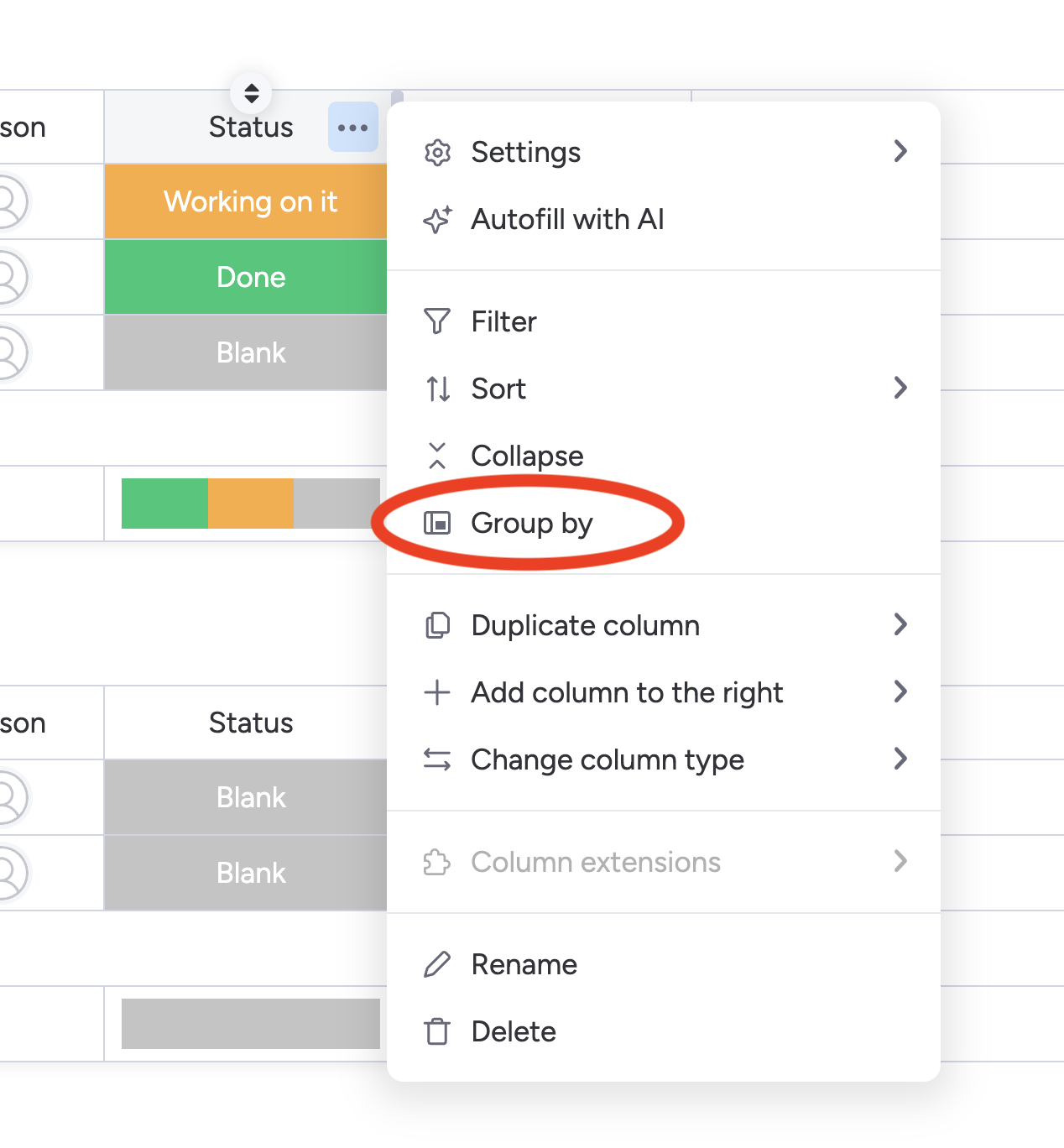 In the drop-down menu, select “Group By Column.” Watch as Monday.com works its magic, re-organizing your data in a snap.